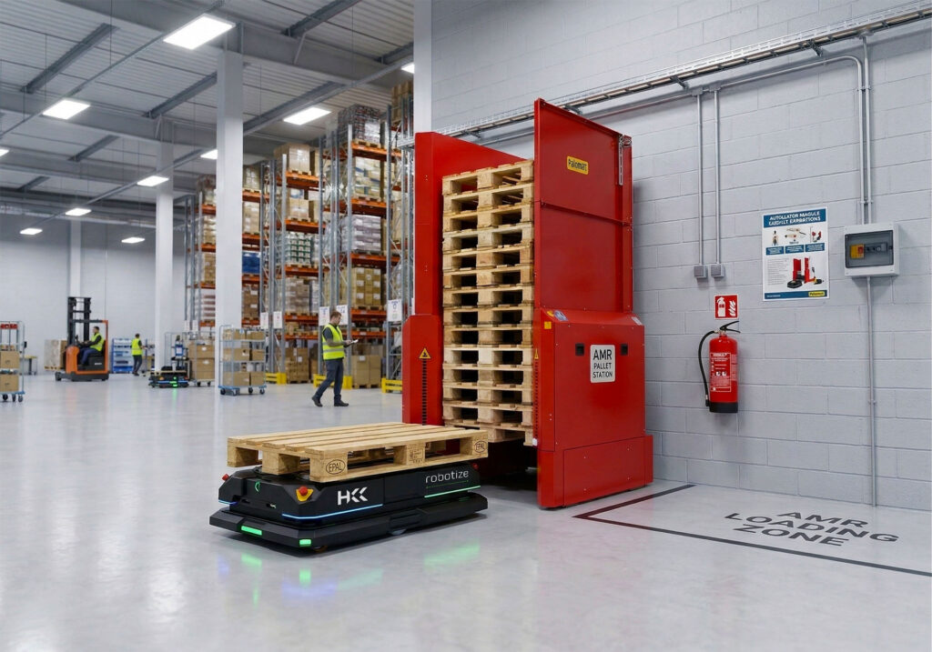 Automatyczne podawanie i odbiór palet dla robotów AMR. Palomat AMR to system automatycznego magazynowania palet (stacker / destacker), który umożliwia robotom AMR w pełni autonomiczną obsługę pustych palet w procesach produkcyjnych i logistycznych. Rozwiązanie eliminuje ręczną obsługę palet i zapewnia uporządkowany, ciągły przepływ materiałów w zakładzie.