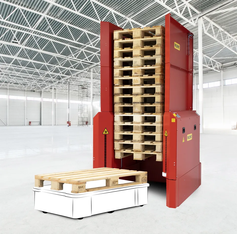 Palomat automatycznie układa palety w stos oraz rozdziela je na pojedyncze sztuki. Dzięki temu roboty AMR mogą zawsze pobrać jedną paletę bez konieczności ręcznej ingerencji operatora.